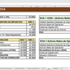 El Archivo de Excel contiene un ejemplo de cómo calcular el EVA en una empresa; también contiene ejemplos del funcionamiento del EVA y cómo mejorar el EVA.