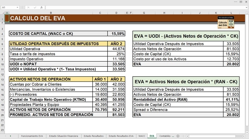 EVA Valor Económico Agregado. Ejemplo y ejercicio resuelto. Archivo de Excel
