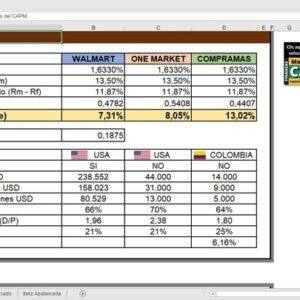 El Archivo de Excel contiene un ejemplo práctico del modelo CAPM (Capital Asset Pricing Model) o Modelo de Valoración de Activos de Capital, calculado en diferentes escenarios o tipos de empresas:
